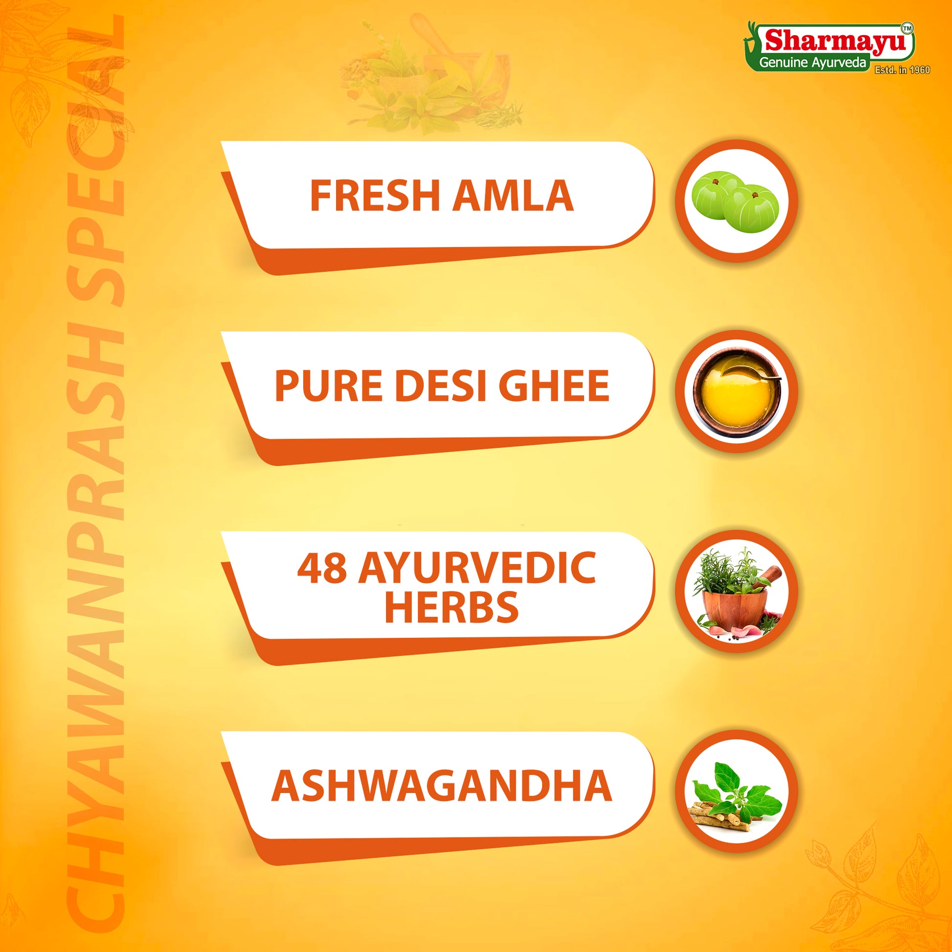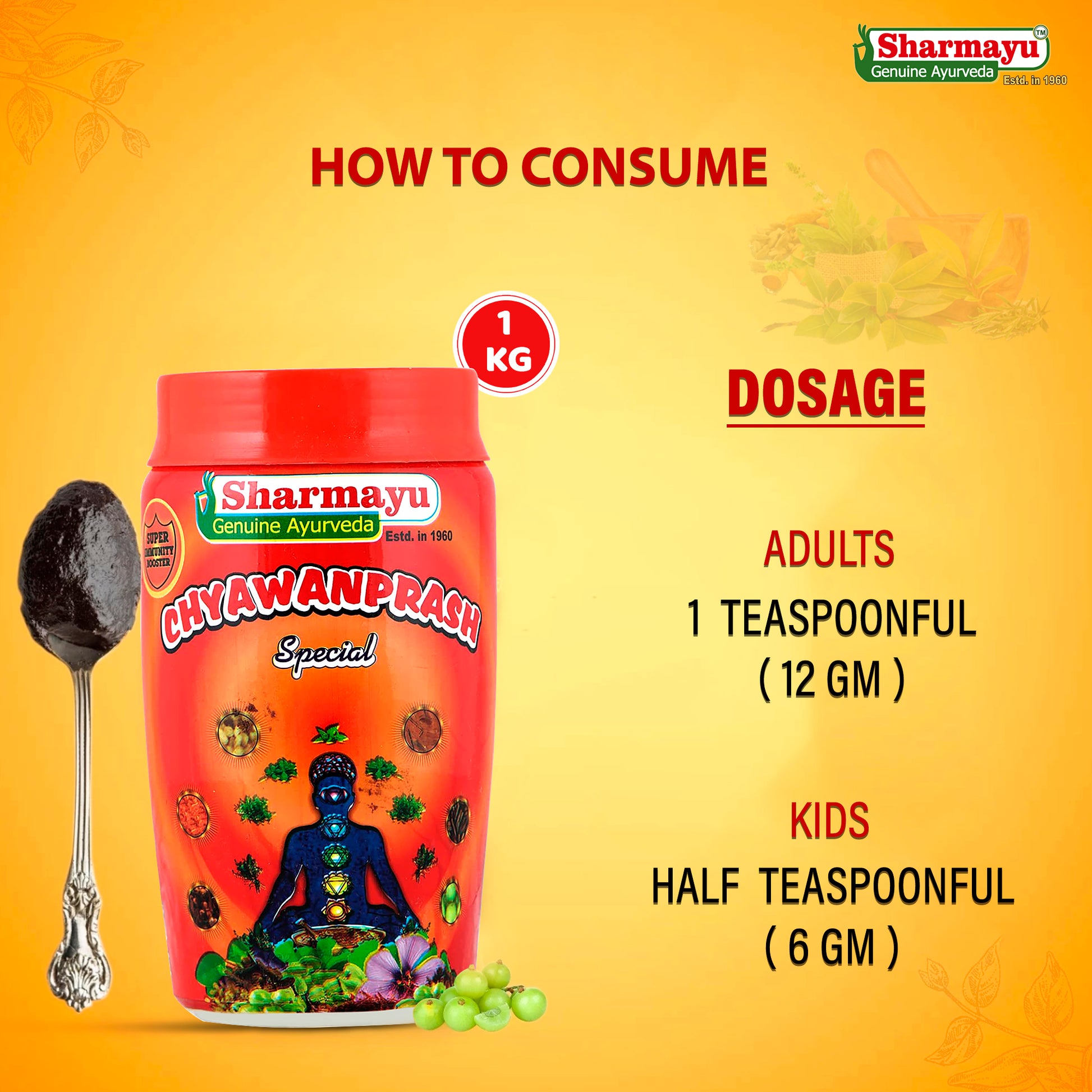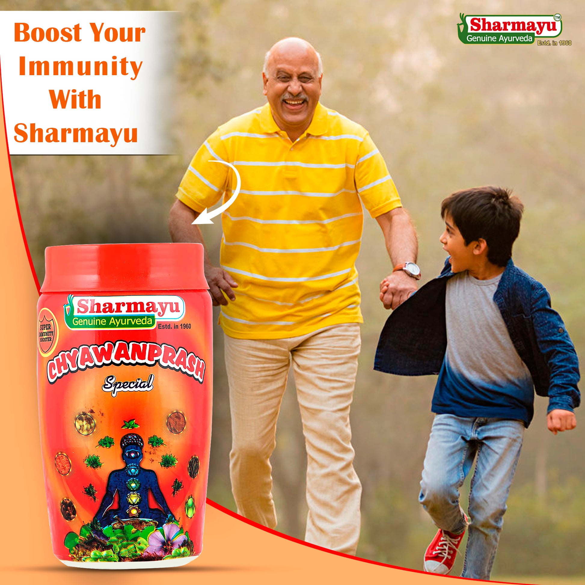 शर्मायु च्यवनप्राष स्पेशल सभी प्रकार के कास, ष्वांस रोग, अस्थमा, फेफड़ों में होने वाली विकृति, शारीरिक एवं मानसिक दुर्बलता, दिल-दिमाग की कमजोरी, पाचनशक्ति की कमजोरी, खून की कमी आदि रोगो में अच्छज्ञ काम करता है। यह शरीर को ऊर्जावान बनाये रखने में विषेश गुणकारी है। विटामिन सी, कैल्शयम तथा प्रोटीन की प्रचुरता हाने से यह शारीरिक शक्ति प्रदान करता है। ताजे आंवलों के अतिरिक्त केशर और मकरध्वज जैसे विषेष गुणकारी द्रव्यों के समावेष के कारण यह सम्पूर्ण परिवार के लिए सर्वोत्तम स्वास्थ्यवर्धक रसायन है।