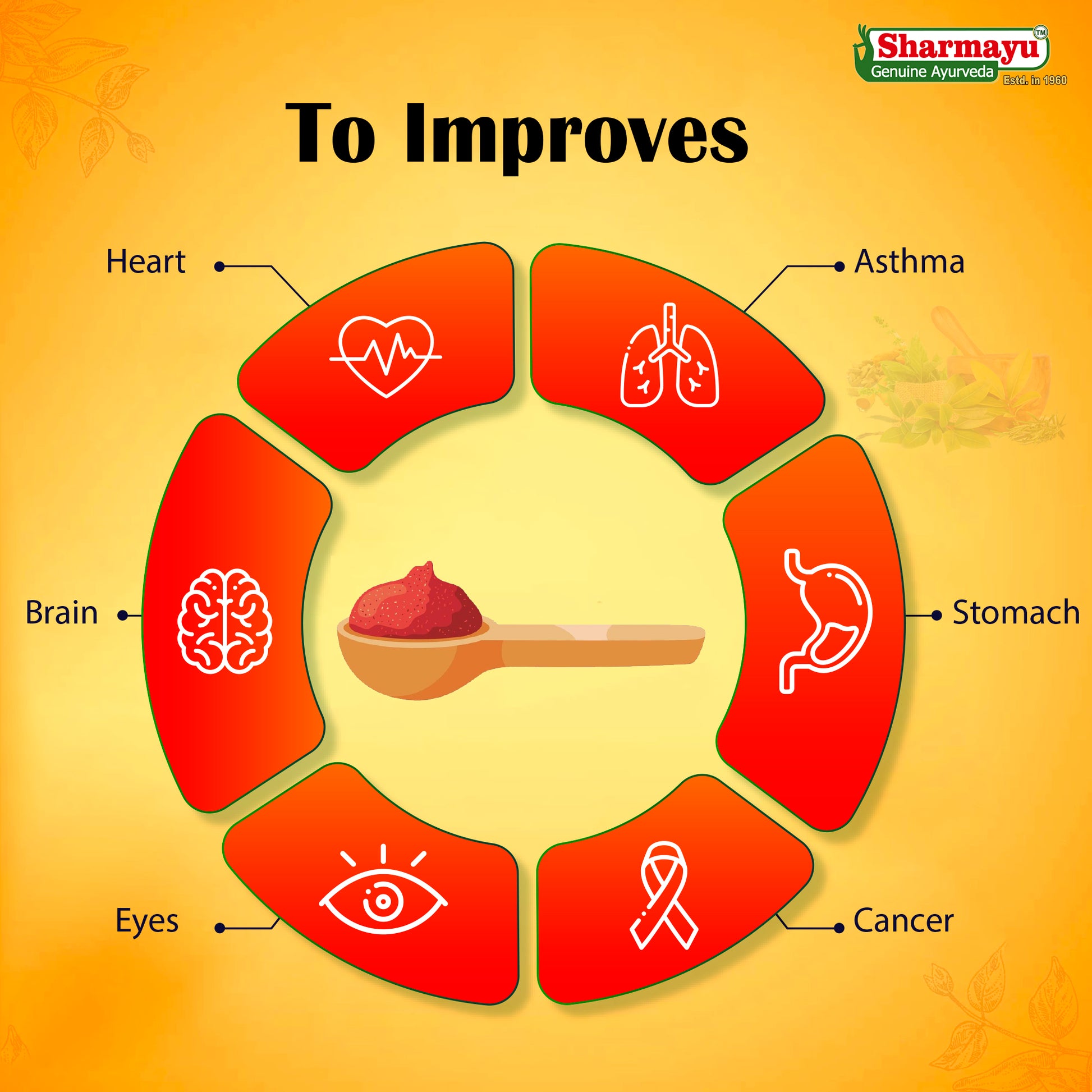 Indication: Chywanprash an ayurvedic preparation which helps to rejuvenate human body. Literature suggests that the name is derived from “ Chywan Rishi” who stayed young and healthy while using it even at a later age. This is a strong immunity booster since it helps rebuilding there cells and tissues and muscle mass. It is powered by Abhrak. It strengthens the while blood cells and promotes body's ability to fight germs and infections caused by various viruses. It is enriched by Amla which is a rich source of Vitamin C.