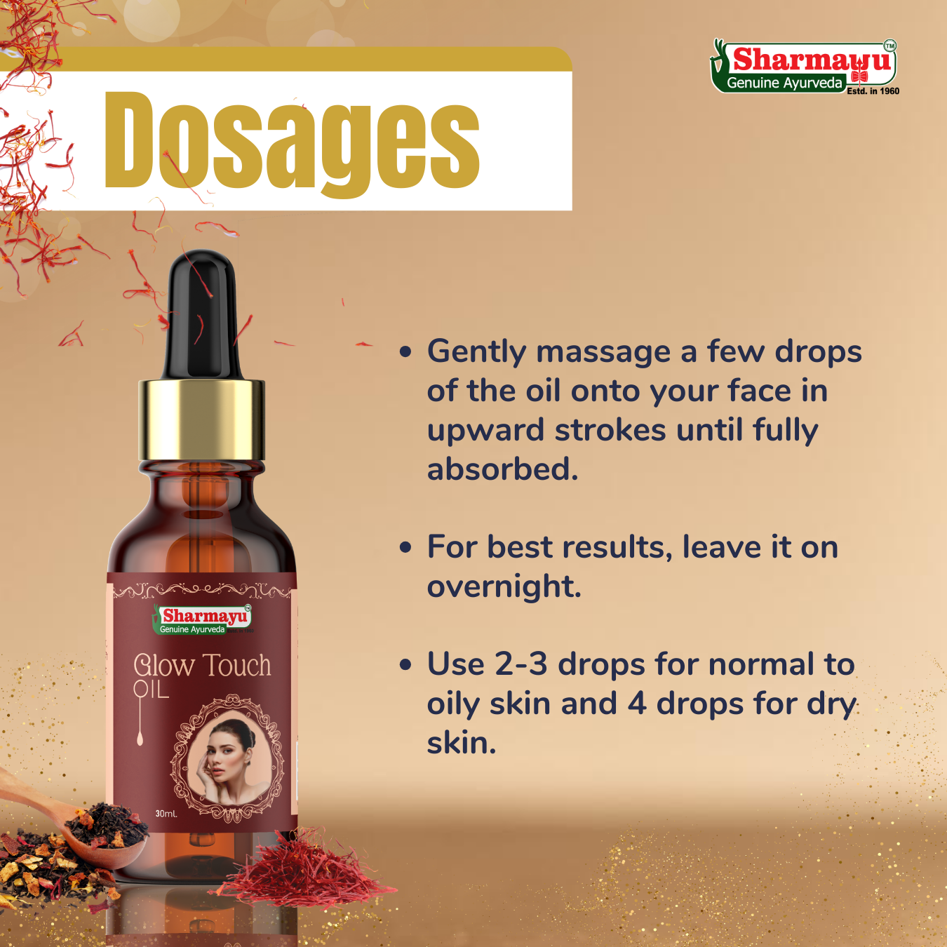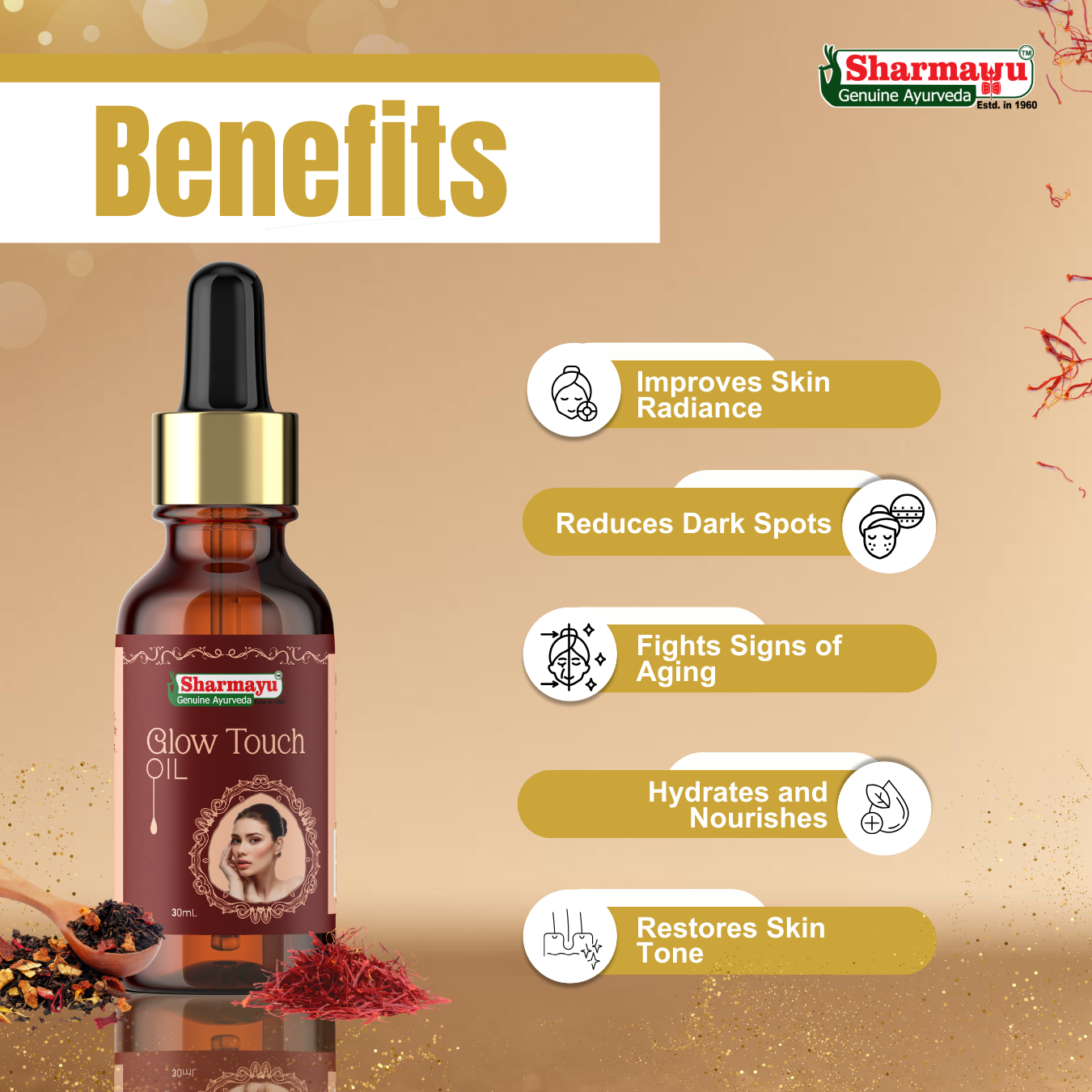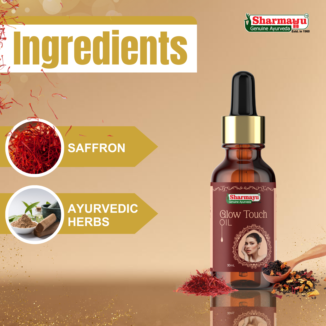 Sharmayu Glow Touch Oil is a premium Ayurvedic oil infused with the goodness of saffron and traditional herbs. Designed to rejuvenate your skin naturally, this oil is your go-to solution for a radiant, spotless, and glowing complexion.