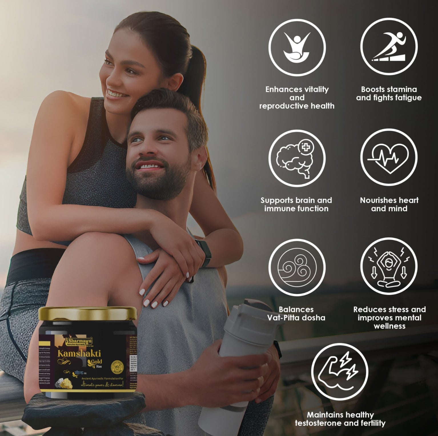 Kamshakti Gold is a powerful Ayurvedic formulation enriched with Swarna Bhasma, Rajat Bhasma, Shuddha Shilajit, Ashwagandha, Kaunch Beej, Jayphal, and Gokhru. This unique blend helps enhance strength, stamina, and vitality while supporting overall physical and mental well-being. It nourishes the heart and brain, balances Vata-Pitta doshas, boosts energy levels, promotes vigor, and helps maintain hormonal balance — making it an ideal daily tonic for renewed energy and endurance.