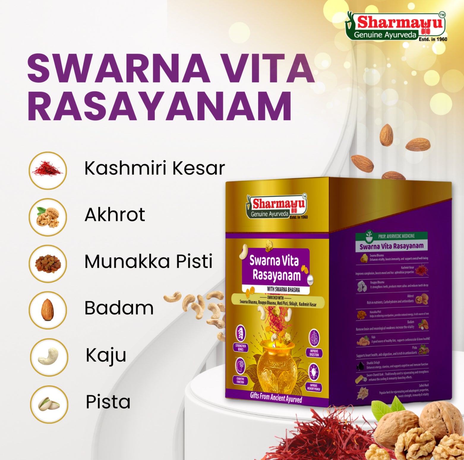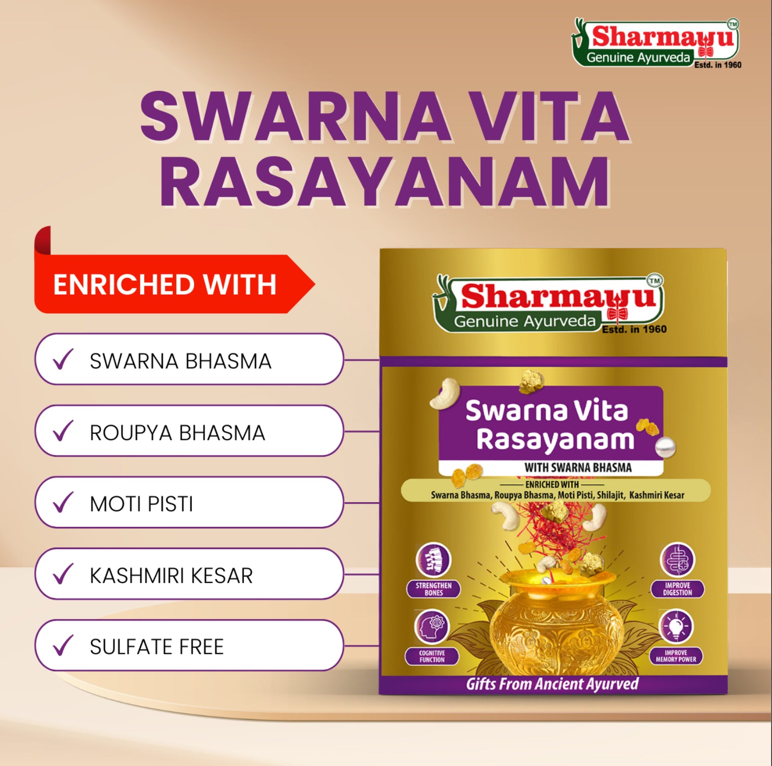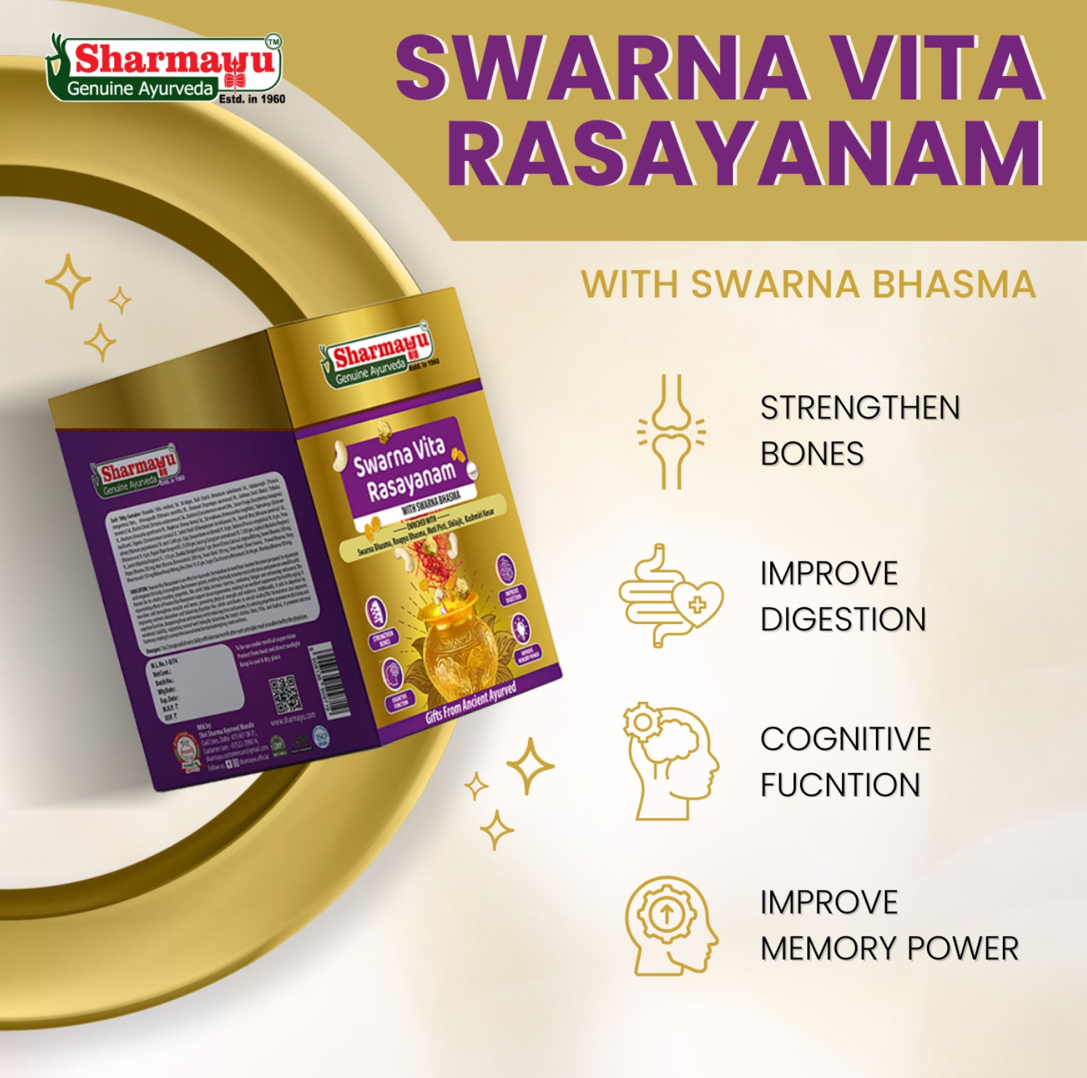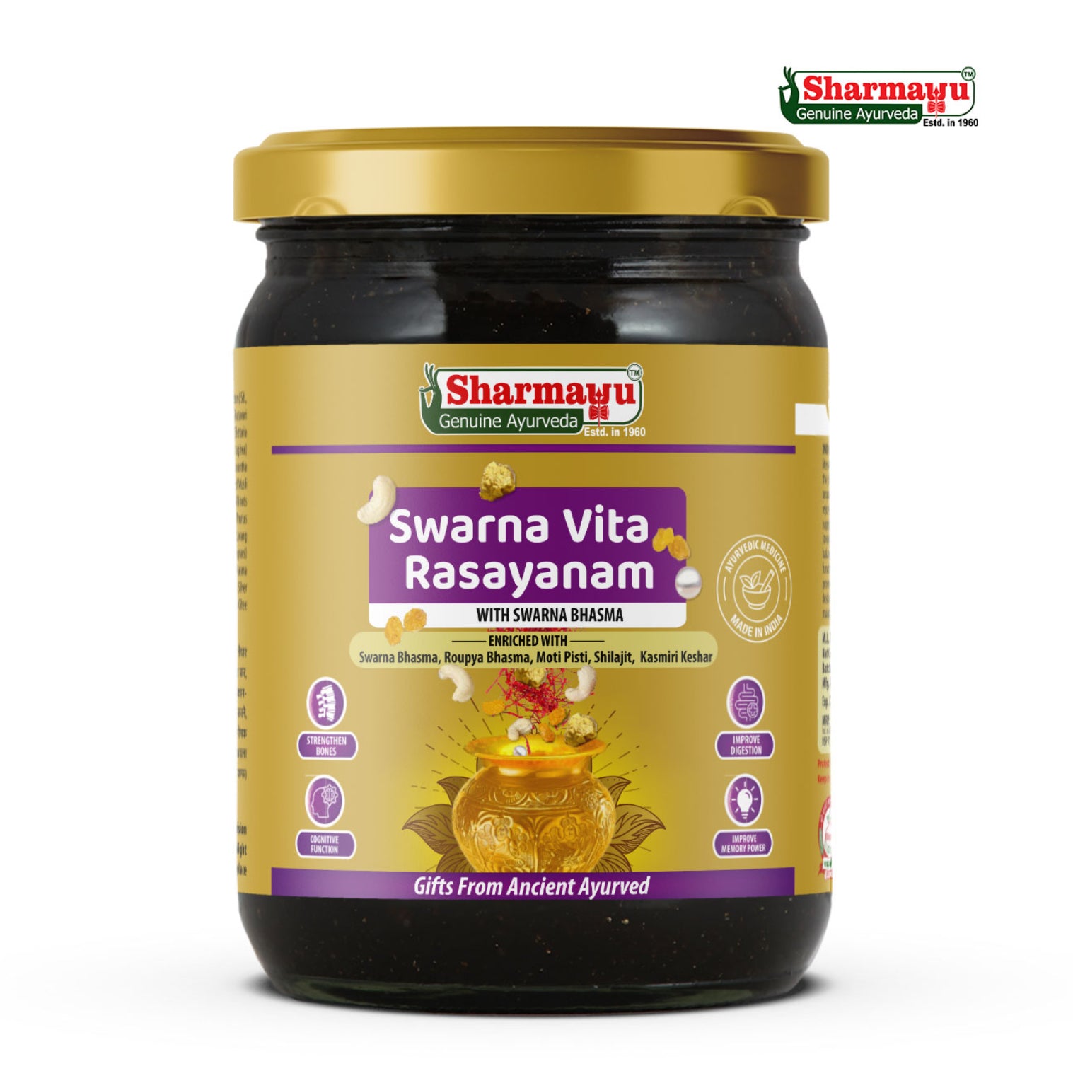 Swarna Vita Rasayanam is an effective Ayurvedic formulation derived from Ancient literature prepared to rejuvenate and invigorate the body. It strengthens the immune system, enabling the body to better resist infections and promote overall health. Known for its vitality-boosting properties, this avleh helps increase stamina, combating fatigue and enhancing endurance. It nourishes and strengthens muscles and bones, promoting physical strength and resilience.